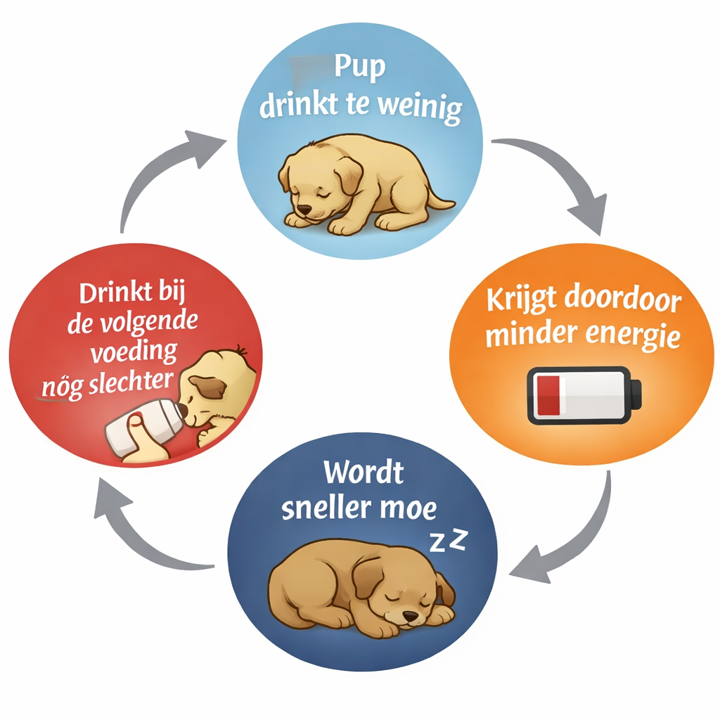 Dit kan leiden tot een vicieuze cirkel. Een pup die te weinig drinkt, krijgt minder energie binnen. Door dat tekort wordt hij bij de volgende voeding sneller moe, waardoor hij opnieuw minder melk opneemt. Zonder tijdig ingrijpen kan dit zich uiten in onvoldoende gewichtstoename, onderkoeling of een te lage bloedsuikerspiegel. Vooral in de eerste levensdagen, bij kleine of zwakkere pups, of in grote nesten waarin niet elke pup even goed aan bod komt, is dit een belangrijk aandachtspunt.